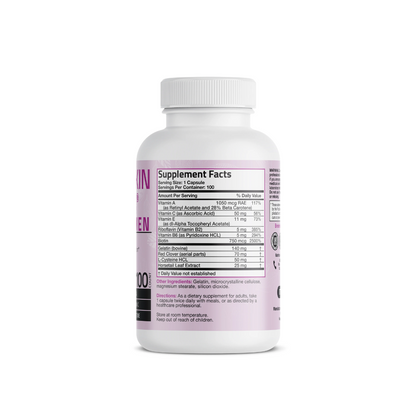 Vitamin A (as Retinyl Acetate and 44% Beta Carotene), Vitamin C (as Ascorbic Acid), Vitamin E (as dl-Alpha Tocopheryl Acetate), Riboflavin (Vitamin B2), Vitamin B6 (as Pyridoxine HCl), Biotin, Gelatin (bovine), Red clover (aerial parts), L-Cysteine HCL, Horsetail Leaf extract